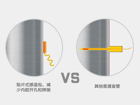 采用貼片式感溫包貼在水箱內(nèi)膽上,可減少內(nèi)膽體開孔和焊接,杜絕感溫盲管泄漏的隱患,水箱更可靠耐用
